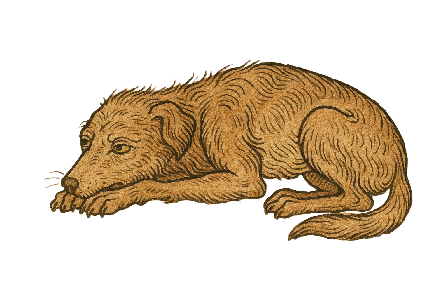The dogs sprawl full-bellied at the hearth. Bones cracked for marrow. Scraps of pork skin, crisp and salt-sharp. The day brought good hunting and better eating and this night has loosened the usually complex humans into simpler creatures of tongue and touch. Most of the dogs are young, active even in rest, ears swiveling at every sound - the door, the rafters, each other.