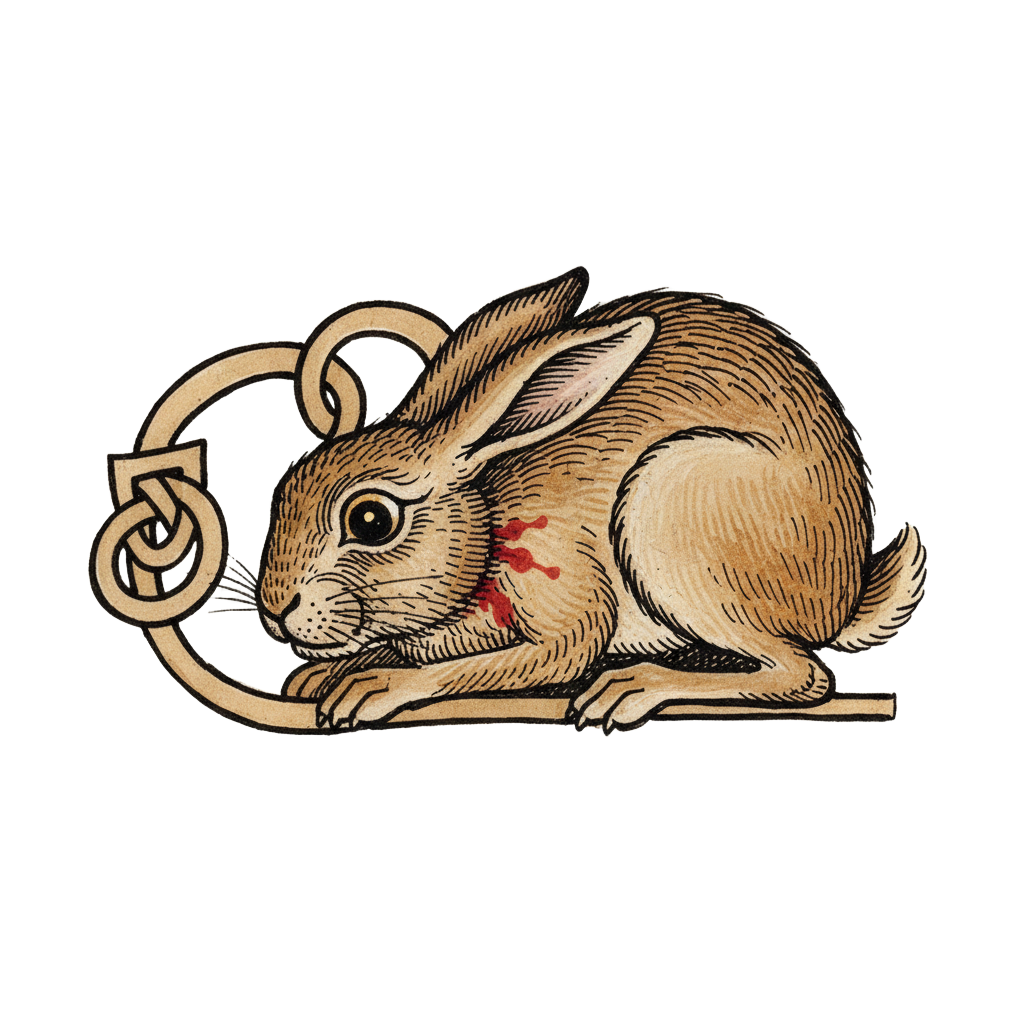 The fire burns low. The hall breathes, snores, farts, dreams. The rabbit, impossibly, sleeps.